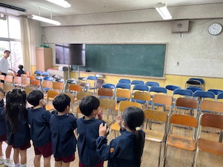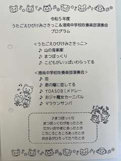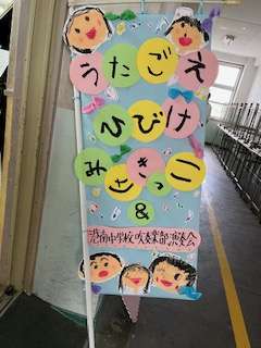 吹奏楽部の特別演奏で「山の音楽家」を、保護者の方と「まつぼっくり」を、そしてみんなで気持ちを込めて「こどもがいっぱいわらってる」を歌いました。中学校吹奏楽部の演奏も聴かせてもらい、いろいろな楽器やその音色に興味をもった子どもたちです。