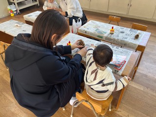 保護者の方と一緒に、まつぼっくりにいろいろな飾りをつけて、ツリーをつくりました。