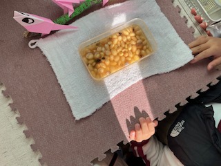 豆腐づくり 公開日 2023/12/05 更新日 2023/12/05 幼稚園日記 夏に育てた枝豆を大豆にしました。この大豆から豆腐をつくりたいという子どもたちの思いを受け、豆腐づくりにチャレンジしました。 水に大豆を浸すと、「大豆、お風呂に入って気持ちよさそう」とじっと見ていた子どもたちです。数日置いておくと、大豆が膨らみ、大きくなっていることに気付き、大豆の大きさ比べを楽しんでいました。 いいね(0)