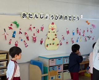 今月は各クラスでの誕生会となりました。それぞれのクラスにいろいろな誕生ケーキが登場し、お祝いしました。
