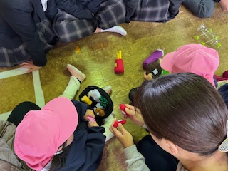 今日は、桃組と黄組の子どもたちが、中学生がつくってくれたおもちゃで遊びながら、触れ合いました。