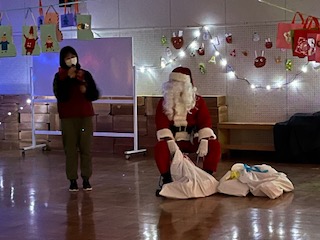 質問をしたり、プレゼントをもらったりしました。お礼の気持ちを込めて、子どもたちが歌を歌うと、楽しそうに体を動かしながら聴いてくれました!