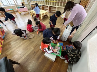 登園後の遊び 公開日 2024/01/16 更新日 2024/01/16 幼稚園日記 寒さが厳しい日々ですが、子どもたちは元気に登園しています。朝の持ち物の始末を終えると、中学生からもらった手づくりおもちゃや、こま回しをして遊んでいます。繰り返し、こま回しにチャレンジするうちに、だ ひもの巻き方や回し方などがだんだんと上手になってきました。 いいね(0)