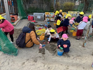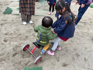 小さい友達に寄り添いながら、嬉しそうに一緒に遊ぶ子どもたちです。