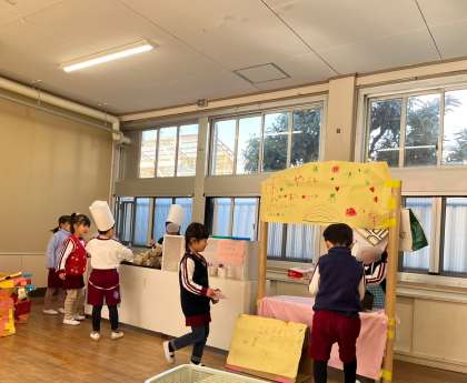 パンやさんごっこ 公開日 2024/01/24 更新日 2024/01/24 幼稚園日記 黄組の子どもたちは、大好きな絵本に合わせて、パンやさんごっこを楽しんでいます。いろいろな大きさや形のパンを並べて、お客さんを呼んでいます。家からパンやさんのチラシを持ってきて、メニューにするなど、友達との会話を楽しみながら遊びを展開しています。 いいね(0)