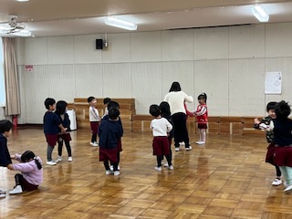 パンが焼きあがる様子を友達と輪になって表現しています。「上手に焼けたね」と先生が声をかけてくれて嬉しそうです。
