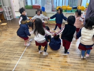 友達と繋がったり、後ろにいる人は誰かな?と考えるのが楽しいようで、「かごめしよう!」と戸外でも誘い合って遊んでいます。