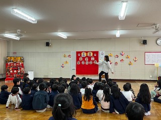 ひな人形やお道具について話を聞いたり、ひなまつりにちなんだクイズをしたりしました。最後はみんなで歌を歌いました。
