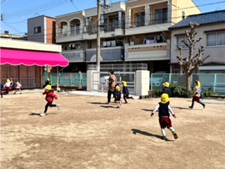 明日は終業式。今日は黄組みんなでおにごっこをしよう!と、全員でおにごっこをしました。