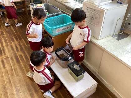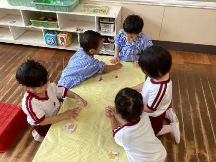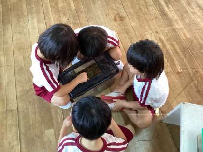 友達もカブトムシもみんな仲良し 公開日 2025/09/02 更新日 2025/09/02 幼稚園日記 1学期に飼っていたカブトムシとも久しぶりに会いました。「元気だったかな」「ゼリー食べてるね」などと優しく語りかけながら、友達と一緒にふれあいを楽しんでいました。テーブルを囲んで、カードゲームをしているももぐみ。ももぐみさんなりのルールがあるようでうが、とても楽しんでいました。 いいね(0)