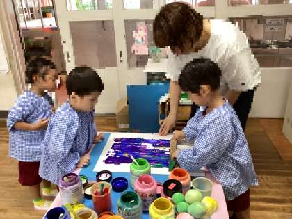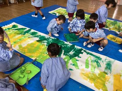 桃組は、はらぺこあおむしのお話に見立てたリズム遊びをしました。お話に出てくる果物をつくったり、アオムシの葉っぱのローラーをしたり、運動会当日までに、自分たちでつくったもので遊んでいます。