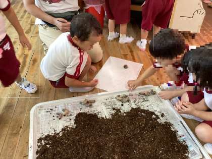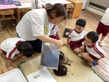 昨年度から育てていた幼虫が成虫になり、卵を産んで、再び幼虫になり、空組が桃組や黄組にも分けてくれました。また、ご家庭からも幼虫を持ってきていただき、毎日、霧吹きをかけてお世話をしています。幼虫がどれだけ大きくなったか、紙の上に置いて身体測定もしました。大きくなるには土をいっぱい食べてうんちもいっぱいして、元気に育っていることを日々、感じて喜んでいます。