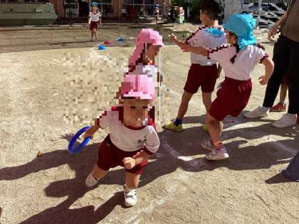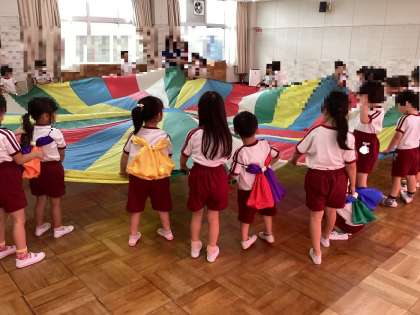 運動会が終わり、それぞれの学年の競技を異年齢で楽しんでいます。空組のリレーには、黄組も桃組も加わって混合リレーとなっています。走る姿も、空組を見て真似て気合い十分。パラバルーンでは、チョウに変身した桃組が一緒に遊びに入れてもらって大満足でした。