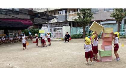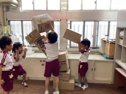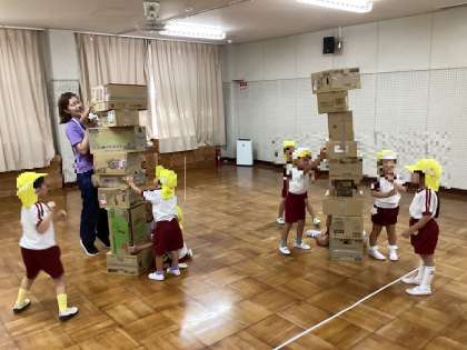 黄組は、保育室で段ボールを積み上げる遊びを楽しんでいました。友達と力を合わせて積み上げるうちに、保育室では狭くなって、リズム室に移動して遊び始めました。積み上げた後は、投げることが大好きな子どもたちだったので、玉投げで崩す遊びも取り入れました。その後、園庭に出て、広い場で伸び伸びと遊びを楽しみ、運動会で披露しました。