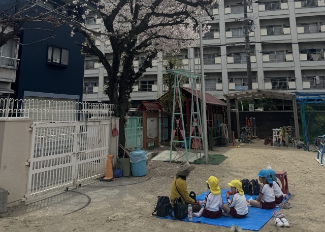 ポカポカ陽気の中、預かり保育の子どもたちが園庭でお弁当を食べていました。気持ちいいね🌸