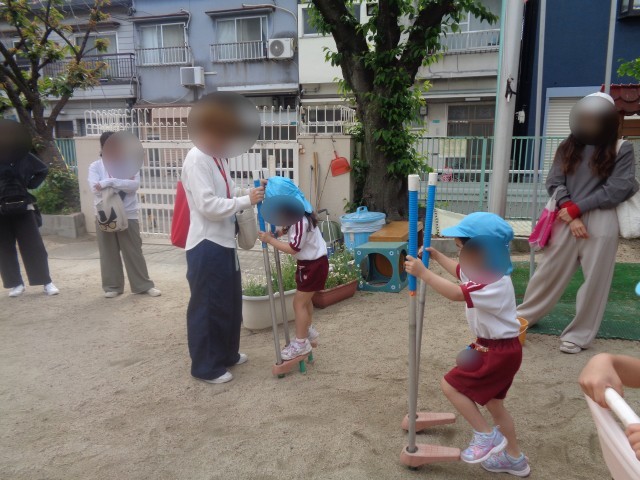 今頑張っている一輪車や竹馬を見てもらったり、一緒に砂場で遊んだりしました。
