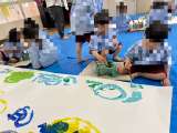 白い紙が、いろいろな色に変身していき、存分に絵の具遊びを楽しんだ後、みんなで雑巾...