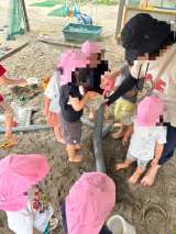 砂場で楽しんでいる水遊び。桃組は、穴掘りしたり、プールを作ったりして水や泥の感触...