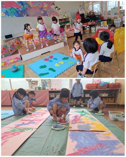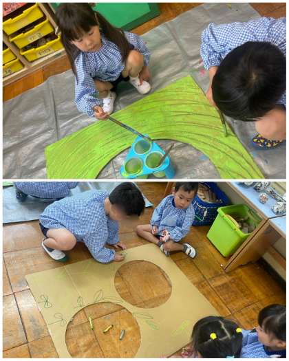 今日も子どもたちの元気な声が聞こえています!「トンネル作ろうよ」「この色ぬるね!」「かわいいダンスのステージ作りたい!」と、友達と一緒にイメージをふくらませながら、作っています。