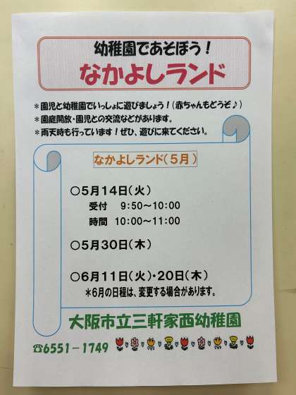 小さいお友達、集まれ〜! 三軒家西幼稚園で、一緒に遊びましょう(^^)/