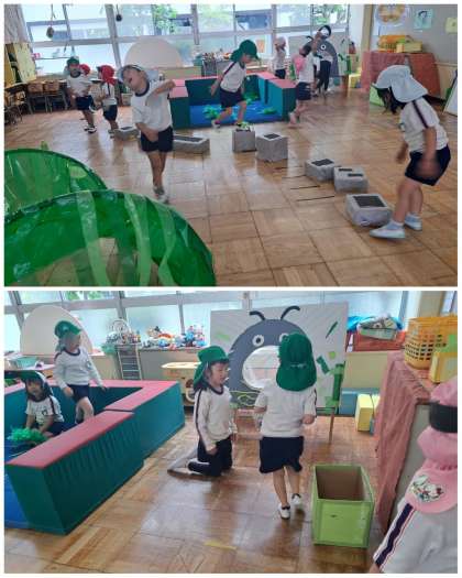 公園のようなサーキットやダンゴムシの広場、ダンス遊びの中から好きなところに遊んでいます。毎日子どもたちと一緒に、「今日はここに並べてみよっか」「すべり台こっちに持ってくるね!」と、楽しくなるように話し合って作っています。
