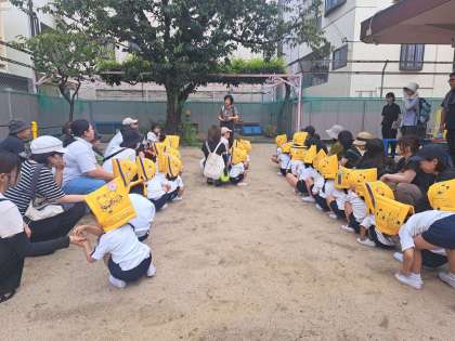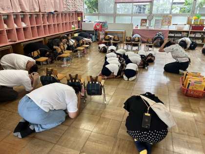 本日15時より大阪880万人訓練放送が流れることもあり、幼稚園でも避難訓練を行いました!!保護者の方と一緒にシェイクアウトのポーズをとり、速やかに園庭に避難しました。いつどこで起きるかわからない地震に備えて、日頃から気を付けておきたいですね!!