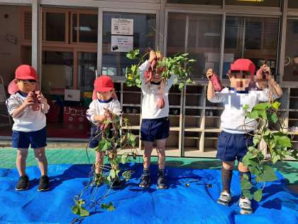 5月に親子でサツマイモの苗を植えました。「どんなお芋ができたかな?」「うんとこしょ、どっこいしょ」とツルを引っ張りました。おいしそうなサツマイモがたくさん採れました〜!