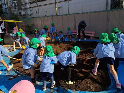 5歳児が掘った後の土をまとめて、肥料を混ぜて次の野菜を植える準備をしてくれました。ありがとう!!