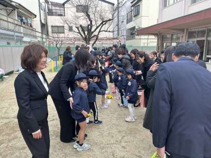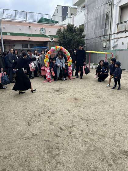 昨日、3,4歳児の保護者と子どもたちに見送られ、5歳児17名が巣立っていきました♪3年間、たくさん友達と遊んだ幼稚園。いつでも遊びにきてくださいね♪みんなのことを、いつまでも応援しています(^_^)/~