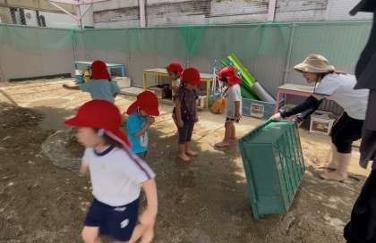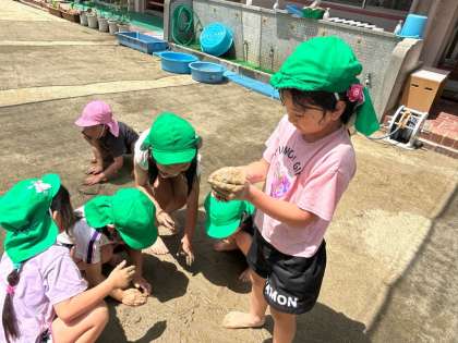 晴れ間には、園庭でどろんこ遊びです(*'▽') どろどろの感触を楽しんでいます!!!