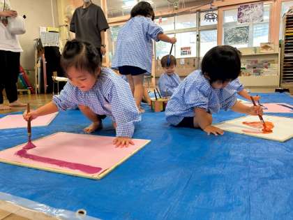 3歳児の保育室で(^^)/ 公開日 2025/06/26 更新日 2025/06/26 きょうのようちえん 絵の具で遊びました。 筆をにぎって、ぐるぐる〜♪ かくこと自体が楽しいのですね(^^♪ いいね(0)