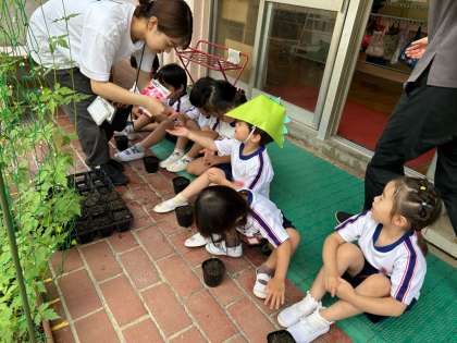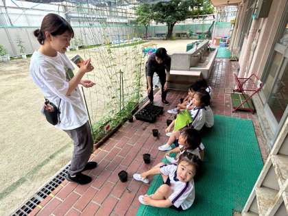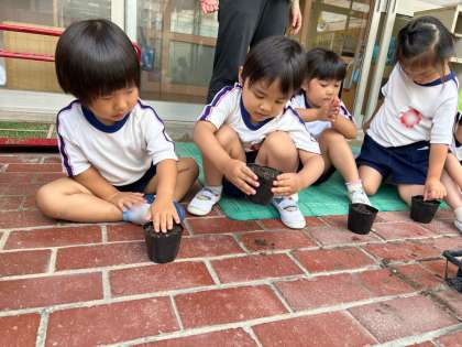 3歳児が秋に咲くコスモスの種をまきました。さて、無事に育つでしょうか(^.^)