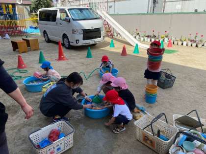 昨日は、一時預かり事業の友達と先生たちでせっせと遊具洗い!