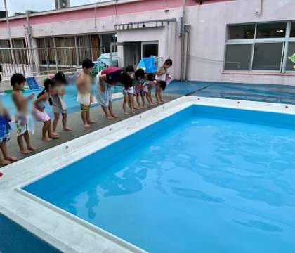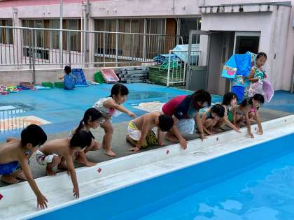 プールでの水遊び!幼稚園のプールは、夏休みから改修工事に入るので、本当に最後のプールでの遊びになりました(>_<)楽しかったよ!!プールさん、ありがとうございました!!