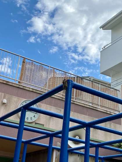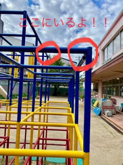 セミの声が鳴り響いています!! よく見ると…ジャングルジムに3匹のクマゼミを発見!!