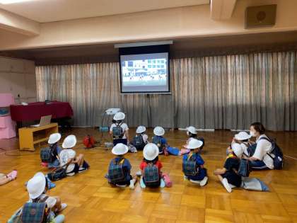 お兄さん、お姉さんが踊るエイサーを見ました👀✨真剣に映像を見る5歳児は、「かっこいい!!」「ばちからビームが出てる!」とのこと。お兄さんたちから、エイサーパワーをいっぱいもらいましたね♪