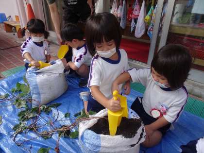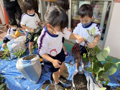 いもほりの歌を歌ってやる気満々!「おいもさん、かくれんぼしてる」「見つけた!」といもほりを楽しみました。