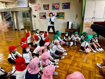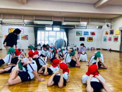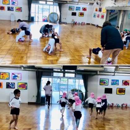 遊戯室で体を思いきり体を動かして遊びました!4・3歳児は、5歳児の姿を見て真似ながら体動かしました(^^♪