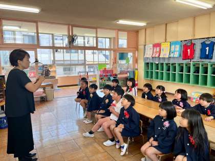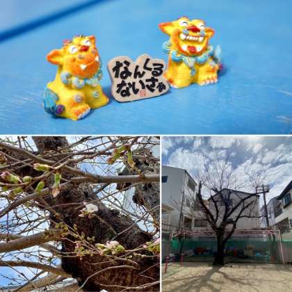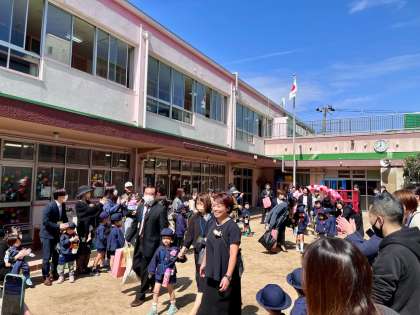 当日の朝、園庭の桜の花が2輪咲きました!桜の花も青空も、みんながお祝いしてくれていました!!ぴかぴかの1年生になって、また幼稚園に元気な姿を見せに来てくださいね(*^^*)