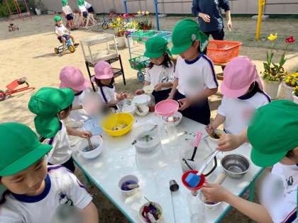 とっても良い天気のなか 公開日 2023/04/11 更新日 2023/04/11 きょうのようちえん 園庭のパンジーやビオラの花を使って、おいしそうなジュースづくりが始まりました(^^)/ そして、5・4歳児が入園式ごっこを行いました!明日、新しい友達が仲間入りすることをみんなで待っています♪ いいね(0)