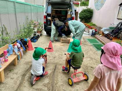 校園営繕園芸事務所の皆さんが、園内の営繕作業に来てくださいました!今年は、砂場の修繕と階段壁面の塗装をしてくださいます!ピカピカになるのが楽しみですね♪よろしくお願いします(^^)/