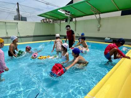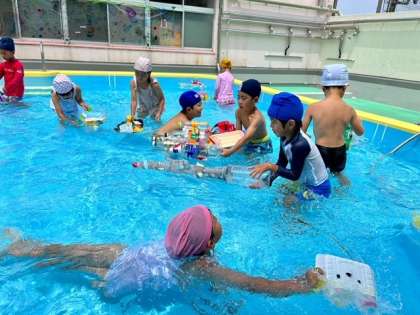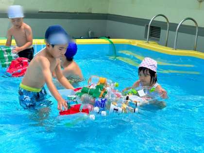 手づくりの船をプールに浮かべて遊びました🚢