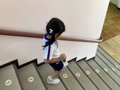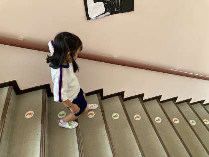 3歳児が、階段に貼った足形をたどって片足ずつ交互に降りています!