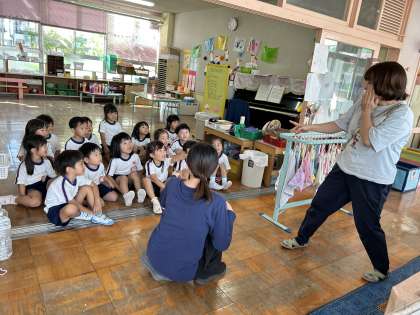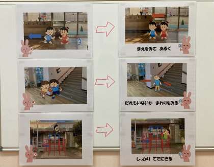 担任と養護教諭で園内で起こりやすいけがを再現して知らせると、「走ったら危ない!」「前見て、歩く!」とすぐに反応が返ってきました!素晴らしい✨