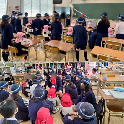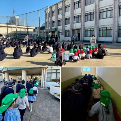 阪神淡路大震災が起こってから29年目を迎えた今日、三軒家西小学校と合同で地震・津波発生時を想定した避難訓練を行いました。