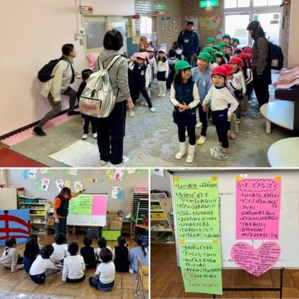 小学生にやさしくリードしてもらいながら校舎の3階までけがなく無事に避難した子どもたちは、みんなで校長先生や園長先生からの大切な話を聞くことができました。