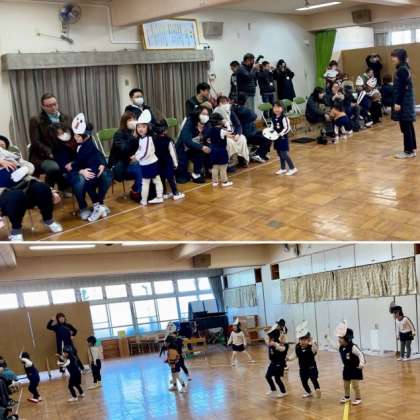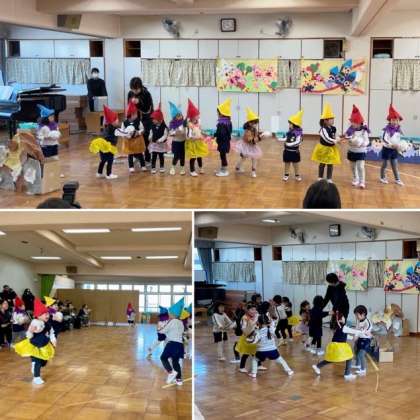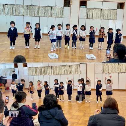 ☆3歳児の生活発表会☆ 公開日 2024/02/07 更新日 2024/02/07 きょうのようちえん みんなドキドキしながら、よくがんばりました! おうちの人たちがニコニコしながら、見たり、拍手をしてくれたりしてとってもうれしかったですね♪3歳児だけでなく、友情出演の4・5歳児もみんなで楽しむことができました(*^^*) いいね(0)