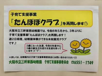 令和6年度の5月から、3年ぶりに子育て支援事業『たんぽぽクラブ』を再開します♪詳しくは、幼稚園内の子育て支援事業委員会までお問い合わせください。たくさんのご参加をお待ちしています!