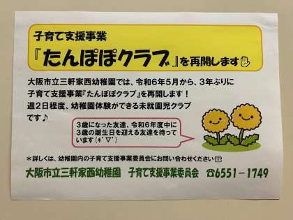 ☆令和6年度 子育て支援事業たんぽぽクラブ☆ 公開日 2024/04/02 更新日 2024/04/02 お知らせ 今年度の5月から、3年ぶりに子育て支援事業『たんぽぽクラブ』を再開します♪ 詳しくは、幼稚園内の子育て支援事業委員会までお問い合わせください。 たくさんのご参加をお待ちしています! *幼稚園内 子育て支援事業委員会 ☎6551−1749 いいね(0)