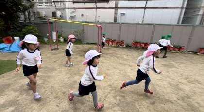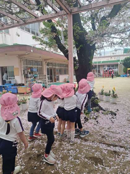 雨が上がって、鬼ごっこが始まりました!「桜の木の陰なら見つからないかな?」「もういいよ〜」「キャー見つかった〜!」
